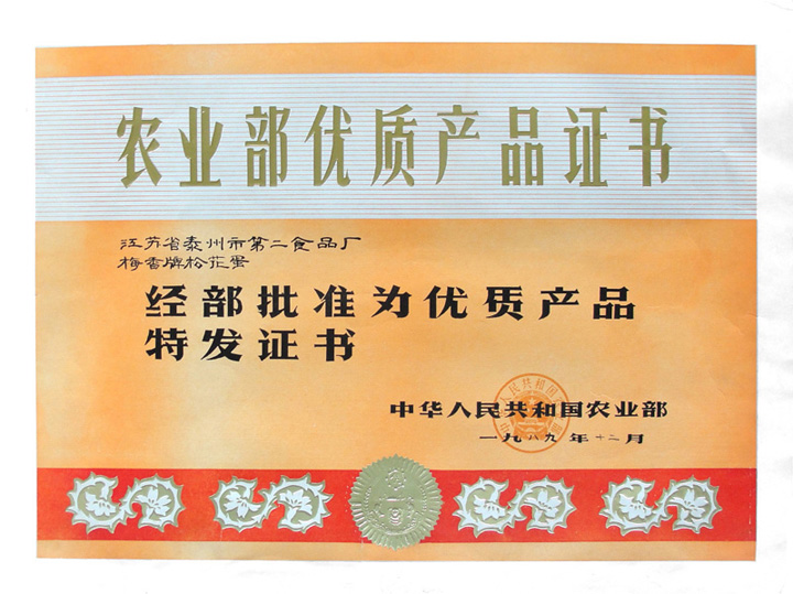 農(nóng)業(yè)部優(yōu)質產(chǎn)品證書